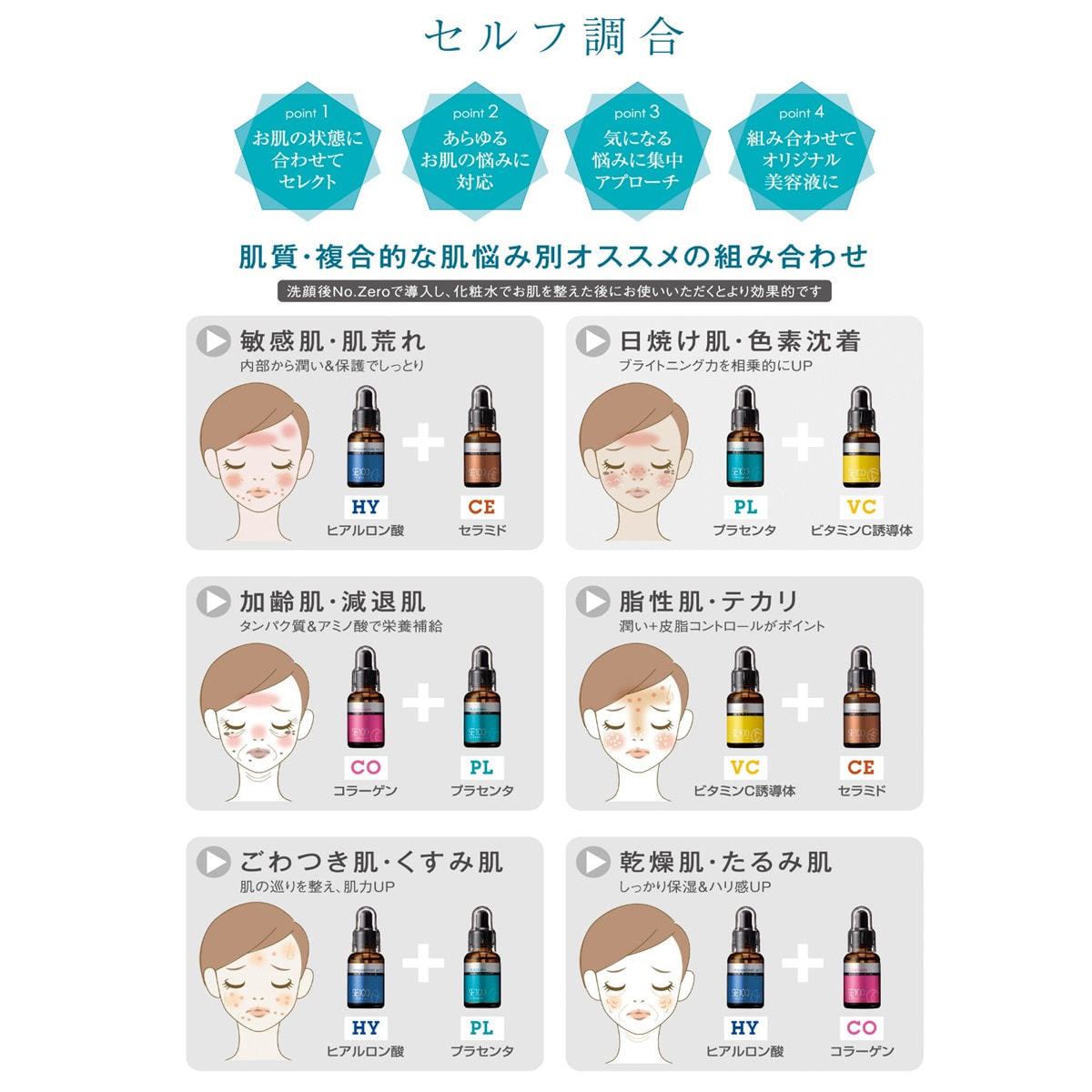4種類のプラセンタ(植物・馬・豚・マリン)を贅沢配合。 豊富なアミノ酸・ビタミン・ミネラル・核酸により、加齢や生活習慣などの影響で ダメージを受けたお肌の巡りを整え、活力のあるいきいきとした肌に導きます。